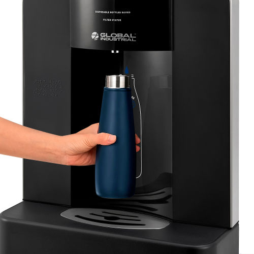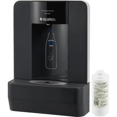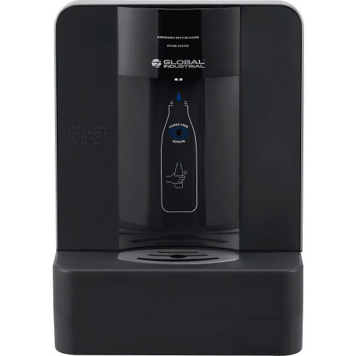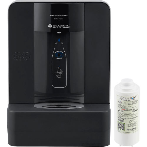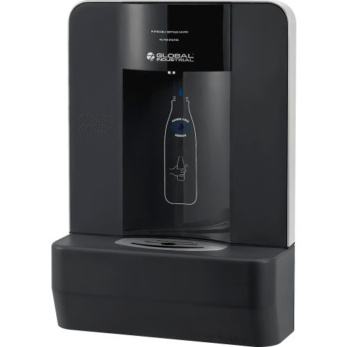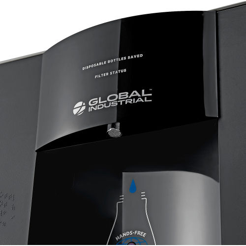 ✓ Touchless activation with automatic shut-off ✓ Ready-to-use PFAS and microplastic filter included ✓ Keyed access door with no tools needed for easy filter changes Keep patrons and staff hydrated with this Global Industrial Surface Mount Water Bottle Filling Station. Featuring a heavy-duty steel construction, a drainage system that eliminates standing water, and a laminar water flow to minimize splashing, this indoor bottle filler is an ideal solution for warehouses, airports, hotels, schools, offices, and more. It has an LED display counter that tracks the number of bottles saved from landfills and an LED filter level indicator that informs you of when it's time to change the filter. Includes a 3,600-gallon capacity PFAS and microplastic water filter to meet all your filtration requirements total PFAS filtration (PFOA+PFOS, PFNA, PFHxS and PFHpA reduction) along with NSF/ANSI 42, 53, 372, and 401 compliance. Its built-in sensor dispenses water into bottles at a quick-fill rate of 1.0 GPM, providing a completely touch-free experience. This item meets ADA guidelines. Limited 1-Year Warranty. 3,600-gallon capacity with advanced filtration system removing total PFAS and full range of chlorine, lead, cyst, turbidity, & microplastics ADA-compliant with "Hold Bottle in Front of Sensor (6 inches to the right)" in Braille on the front panel Quick-fill rate of 1.0 GPM ABS body with durable galvanized steel frame Rust and dent-resistant lower cover Compatible with replacement filter model number 761215PF Display center counts disposable bottle saved from waste and LED bars flash when a filter change is needed.
