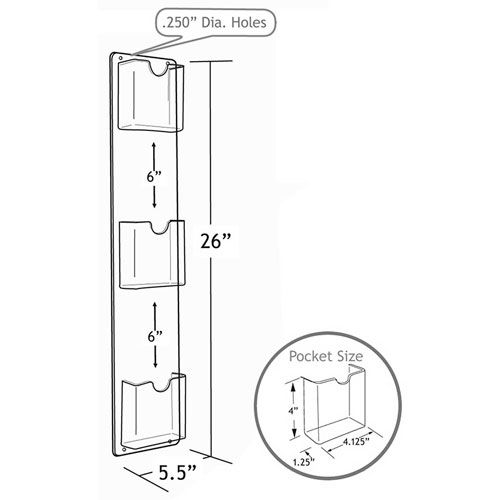 This Three-pocket wall mount brochure holder maximizes advertising opportunities. It measures Wide X High. The clear acrylic construction allows for easy viewing. The brochure holder has drilled holes for hanging. Dimensions per pocket: 4.125" Wide X 1.25 Deep X 4" High Hardware not included.