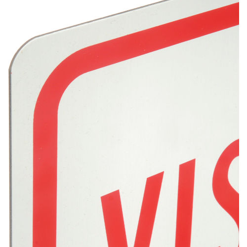 Global Industrial Aluminum Sign - Visitor Parking Only - .063" Thick, 932136 Top quality impact and corrosion resistant .063 aluminum sign has a glossy baked enamel finish. Pre-drilled for easy mounting. Text on Sign: VISITOR PARKING ONLY.