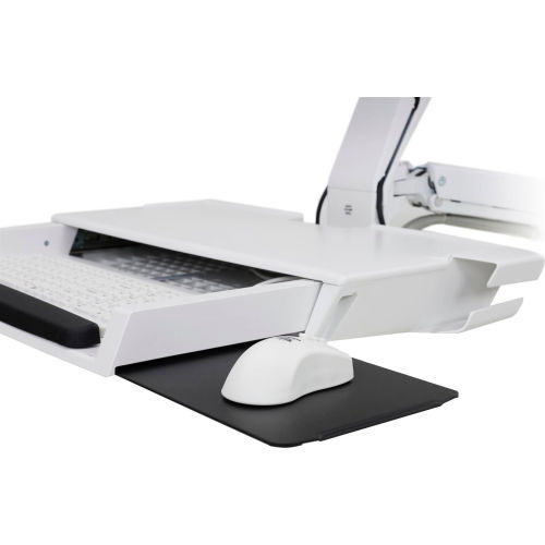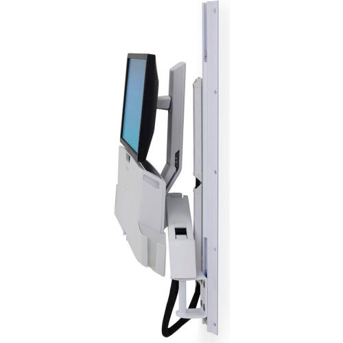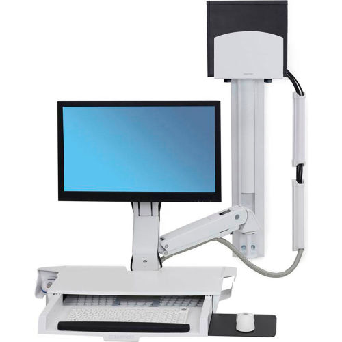 Let caregivers in your healthcare organization work sitting or standing with everything they need at their fingertips. This sit-stand combo system holds a monitor, barcode scanner, medium CPU, wrist rest and mouse, plus a sturdy worksurface and pull-out keyboard tray, all on the same height-adjustable arm for an ergonomic fit that supports the best workflows (and comfort). Specifications: Includes Combo Arm, 34" Wall Track with (2) black track covers, Medium Silver CPU Holder, CPU spacer, (2) 10" cable channels, CPU and Arm track mount bracket kits, Wall Track fasteners for concrete and wood, CPU direct wall mount kit, height-adjustable LCD mount, wrist rest, scanner and mouse holders, integrated keyboard tray, slide-out mouse tray, handle, VESA monitor mounting kit, cable tiesDurable, easy-to-clean exterior composed of aluminum, high-grade plasticWeight Capacity: display = 6 - 18 lbs (2.7 - 8.2 kg); worksurface = 10 lbs (4.5 kg); keyboard, mouse and barcode scanner = 4 lbs (1.8 kg); CPU = 40 lbs (18.2 kg) Lift Range: LCD and keyboard adjusts 20" (51 cm) in tandem with single-motion; LCD adjusts 5" (13 cm) independently; maximum LCD height adjustment = 25" (64 cm) Monitor up/down tilt = +25 /-5 Patented CF lift-and-pivot motion technology provides premium 25-inch (64 cm) LCD height adjustment, portrait to landscape rotation and 30 tilt Mounting Standards: VESA FDMI, MIS-D, 75/100, C (hole patterns = 100 x 100 mm and 75 x 75 mm)Integrated mouse and barcode scanner holder provide easy accessFold-down worksurface / keyboard tray to support workflow needs. Worksurface is 22.75"W x 10.6"D (57.8 x 26.9 cm). Keyboard tray is 18.6"W x 9"D (47.2 x 22.8 cm). Maximum allowable keyboard height = 1.35" (34 mm)Back-tilt keyboard tray adjustable from 0 to 10 CPU Size Range: 3-3/8" to 8" (9 to 20 cm) wide; CPUs down to 2" (5 cm) wide can be accommodated by installing the included CPU spacer within the holderCPU Holder includes fasteners for locking the holder's widthOptional Extender (45-261-026) increases range of motion for even greater reachCan be configured to hold a laptop instead of an LCD display; also order the LX Notebook Tray (50-193-200)Product Weight: 41 lbs (19 kg)Warranty: Five (5) years.