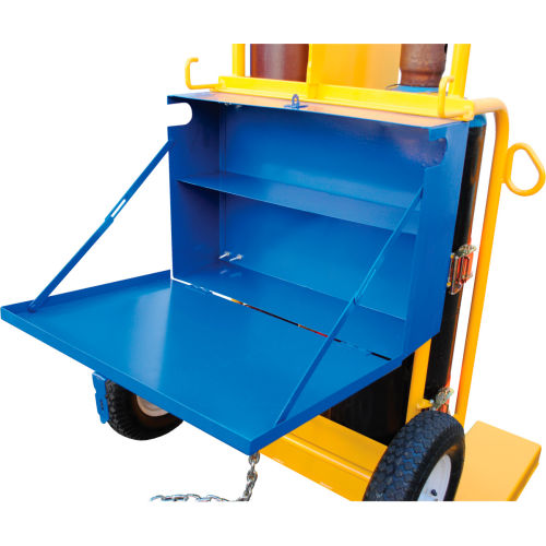 WELDING CYLINDER & TORCH CART Versatile Cart Transports Welding Tanks and Accessories to the Job Site This handy truck is designed to carry welding cylinders, hoses and a cutting torch in a single trip. Each cart includes two tank compartments, (1) 13-3/8"W and (1) 10-7/16"W, with ratcheting straps to retain oxygen and acetylene cylinders, and brackets are included for holding a torch and hoses. Twin ergonomic handles and oversized 16" diameter pneumatic wheels offer "tilt-and-go" portability. Convenient open-top tray is included for storing welding accessories. All-welded steel construction with a durable safety-yellow enamel finish. Shipped assembled. Cart includes a Lockable Storage Box that offers storage for regulators. Storage box includes a hose opening so that the regulator does not need to be disconnected for storage. Cart also includes a Lifting Eye for overhead crane lifting. Lifting eye is 2" diameter and 7/16" thick. Additionally, this cart features integral Fork Pockets that allow transportation with a fork lift. Usable size of each fork pocket is 7-"W x 2-"H on 32" centers.