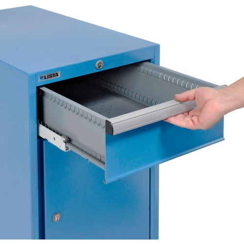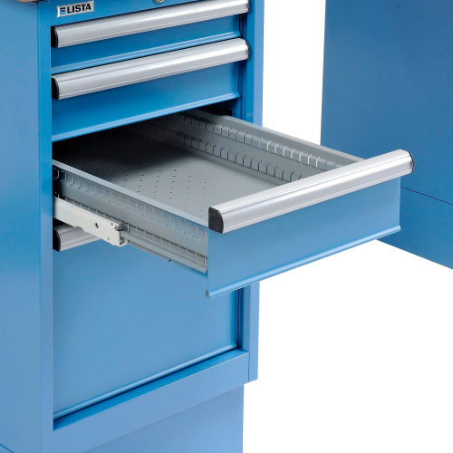 ✓ Square-edge maple Boos butcher block by John Boos & Co. ✓ High weight capacity to handle most projects and tasks ✓ Stable base with drawer & cabinet EXTRA DEEP PEDESTAL WORKBENCHES 4 Drawer/Cabinet Work Bench - Square Edge Maple Top Heavy gauge steel construction. Fully welded drawers extend 93% for easy access, have a capacity of 150 lbs. with full width recessed handles and smooth rolling steel ball bearings for easy opening. Pedestal and Cabinet can be placed on either side for interchangeable installation. Pedestal dimensions with base are 16-7/8"W x 28-1/2"D x 33-1/2"H. Cabinet features Tip-Prevention safety system and include lock with two keys. This 17-3/4"H locking cabinet includes a top 5"H drawer. 4-drawer pedestal includes one 3", two 5" and one 7"H drawer. Bench top is 1-3/4" thick kiln-dried maple top with mineral oil protectant and standard square edge. Baked enamel finish. Easy assembly. Lifetime Limited Warranty.