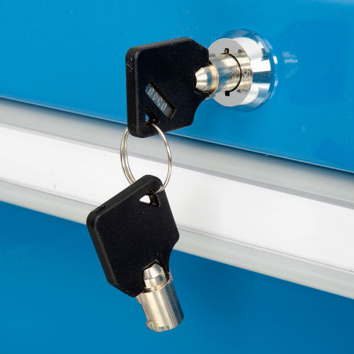72"W x 30"D MODULAR 3 DRAWER WORKBENCH Birch Butcher Block Square Edge Top Modular workbench features heavy duty all welded steel drawer cabinet with 2" square 14-gauge steel leg. Drawers hold up to 200lbs and feature central lock cylinder. Drawers open on side mounted roller glides that provide full extension and have full width handles for better grip with a flush, catch free front. Total Weight Capacity for workbench in 5000 Lbs, evenly distributed. Color: Blue.
