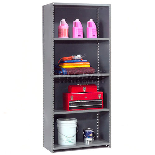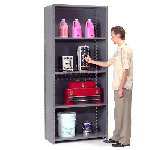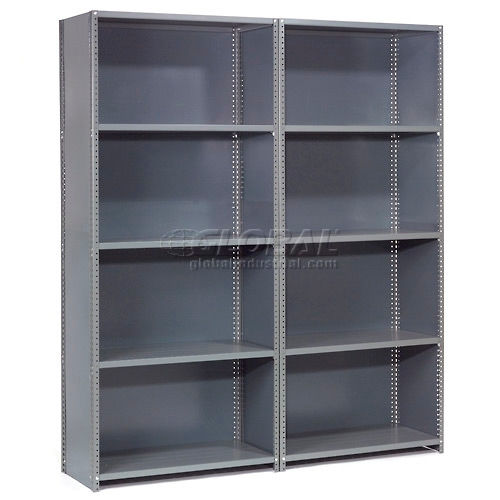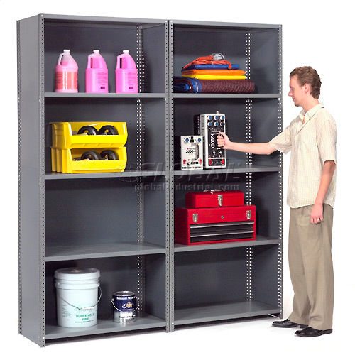 Starter Unit Roll-formed, ribbed steel shelves have box beam reinforced edges to provide increased load capacities. Quad clip safely secures shelves to uprights while allowing easy adjustment on 1" centers. Heavy duty 14 gauge steel uprights support shelves. Closed side and back panels retain loads. Gray baked enamel with anticorrosion undercoat last for years. This Starter Unit includes 4 uprights, 5 shelves, 4 quad clips per shelf, 1 back and 2 side panels plus all required nuts and bolts. All panels shipped in (2) or (3) pieces to save on shipping costs.
