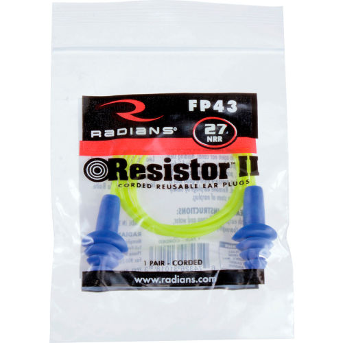 Radians FP43 Resistor II NRR 27 dB Reusable Corded Soft Earplugs, 200/Box Tested to ANSI S3.19-1974 standards, this dielectric earplug has an NRR of 27. Its tapered design and sturdy stem allow for easy insertion and removal and a comfortable fit in the ear canal. Made from latex-free silicone rubber, the FP43 is non-irritating to the skin. Packaged 100/Box. Features: Four flanges for a safe, accurate and comfortable seal. Reusable silicone rubber provides superior comfort and protection. PVC dielectric cord conveniently hangs around neck. Latex free Soap & water washable. NRR 27 dB.
