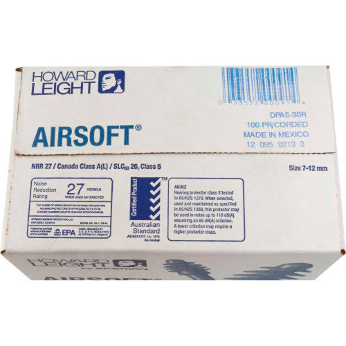 AHoward Leight DPAS-30 AirSoft Ear Plugs, Reusable, NRR 27, Corded, 100 Pairs/Box Howard Leight AirSoft Multiple-Use Earplug features an advanced air pocket design with internal noise blocking fins. The four-flange profile creates better a seal in the ear canal. With less pressure in the ear canal, user eliminates that "plugged up" feeling. With rounded flanges, the tapered shape creates a more comfortable fit. The firm stem facilitates easy insertion and removal. This model feature outstanding noise-blocking protection. Recommended Industries are agriculture, chemical, food service, forestry, government, law enforcement, manufacturing, medical, military, mining, municipal services, oil and gas, pharmaceutical, steel and metals, transportation, utilities and welding. Regulations: 29 CFR 1910.95 - OSHA Occupational Noise Exposure (US)ANSI S3.19-1974 - Attenuation Test Protocol (US)Part II, (R.S.C. 1985, c. L-2) - Occupational Noise Standard (CAN)Z94.2-1994 - Attenuation Test Protocol (CAN)2003/10/EC - EU Hearing Directive89/686/EEC - European Directive/PPECategory II - EC Category PPEEN 352-2:1993 - EU StandardsNOHSC: 1007 (2000) - National Standard for Occupational Noise (AUS/NZ)AS/NZS 1270:2002 - Attenuation Test Protocol (AUSNZ)NR 15 - Security and Health of Work, Annexes 1 and 2, n 3.214/1978 - Occupational Noise Regulations (BR) ANSI S12.6/1997 - Method B - Attenuation Test Protocol (BR)9001:2008 - ISO.