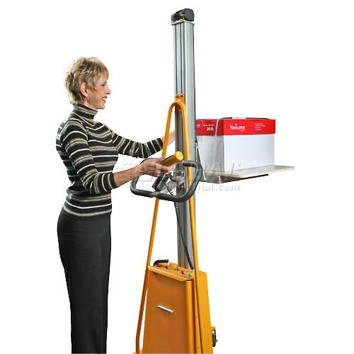 Wesco BATTERY OPERATED OFFICE AND LAB LIFT TRUCK Highly maneuverable light duty lift is perfect for heavy office files, computers and clean rooms. Place loads on the 19"W x 23-3/4"D x 9/16" thick acrylic platform and raise with battery powered motor. Fits through doorways and narrow aisles easily. Non-marking polyurethane 5" steer wheels with brakes and 2-3/4" load wheels. Platform has 9-1/4" load center. Features include push button remote control with 7' cord, (2) 12V maintenance-free sealed lead-acid batteries, integral 110V AC charger, low battery alarm and a steel frame with lightweight aluminum mast.