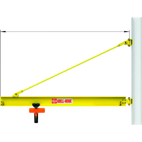 Abell-Howe Top-Braced Wall Mounted Jib Crane WMC216 2000 Lb. Capacity with Span with 200 degree rotation TOP-BRACED WALL MOUNTED JIB CRANE with 200 Degree Rotation for maximum hook coverage. This all purpose tie rod wall mount jib crane is designed for heavy duty applications and produced from high-grade steel components. Hinge mounts easily to any substantial structural steel building column at desired height. Tie rod is threaded for ease of installation and field adjustments. Crane fittings have bearings with lube fittings for long lasting life and ease of movement. Structural steel is finish painted in highly visible Safety yellow enamel. Made in the USA.