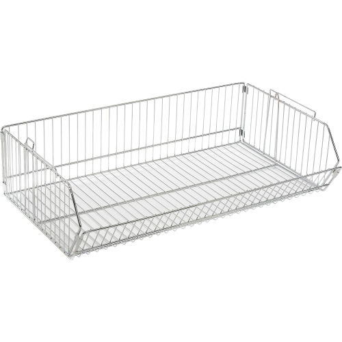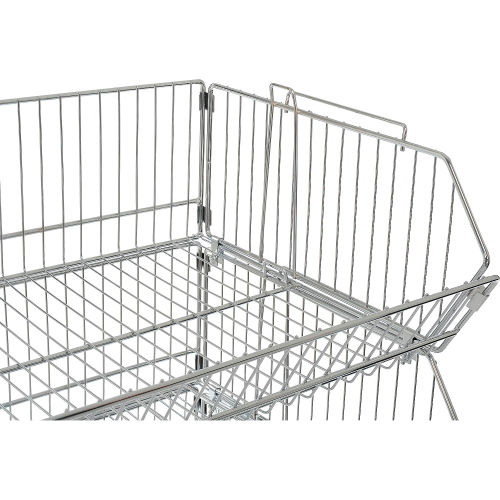 Stackable Wire Storage Bin Rack, 36"W x 20"D x 45"H, 5 Wire Bins These interlocking wire storage bin racks organize and store material in warehouse, production, assembly areas and store display. Position wire bins side by side or back to back. Open mesh bin rack permits quick inventory control. Bin shelves made of industrial grade rust and corrosion-resistant welded .283 diameter wire frame, with .105 diameter cross wire construction for ultimate strength and rigidity. Storage bins have a maintenance free triple-plated chrome finish. Each bin is 100 lb. weight capacity. The rack unit with optional dolly is 1000 lb. weight capacity evenly distributed. Measures 36"W x 20"D x 45"H. Includes 5 wire bins (5) 36"W x 20"D x 9"H.Optional Dividers create a variety of compartment sizes. Optional Dolly Base turns your storage rack into a mobile unit. Assembles easily. Shelf Bin Size Reference <div> 2-3/4 W 4-1/8 W 6-5/8 W 8-3/8 W 11-1/8'W 11-5/8 D x 4 HA4B4C4D4E4 17-7/8 D x 4 HF4G4H4I4J4 23-5/8 D x 4 HK4L4M4N4O4 11-5/8 D x 6 HA6B6C6D6E6 17-7/8 D x 6 HF6G6H6I6J6 23-5/8 D x 6 HK6L6M6N6O6 11-5/8 D x 8 HA8B8C8D8E8 17-7/8 D x 8 HF8G8H8I8J8 23-5/8 D x 8 HK8L8M8N8O8div.