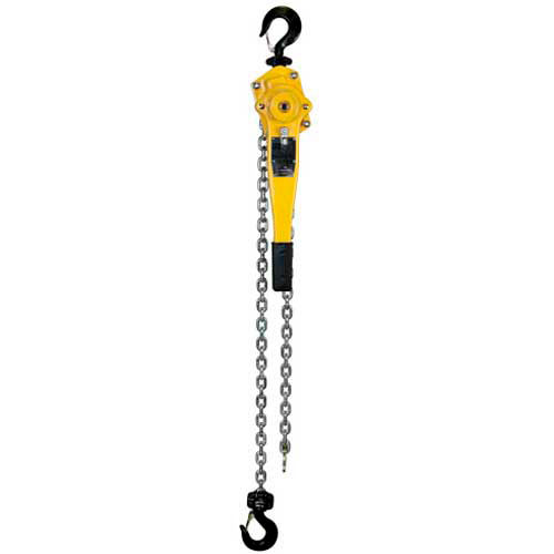 OZ Lifting Lever Hoist With Standard Overload Protection 1-1/2 Ton Capacity Lift Premium Lever Hoist - Lever Hoist from 0.75 ton through 9 ton. Standard lifts of 5, 10, 15 and 20 ft (All standard lifts in stock) We custom rig to meet your needs Rigged and tested in the U.S.A. Many Features and Benefits not found on standard hoists, make our products the safest on the market. Features and Benefits Standard Overload Protection - This is standard on all hoists and is factory set. The overload is integral with the hoist and prevents the operator from overloading the hoist. When activated, the overload will not allow hoist operation. When the overload is activated, lower the load, if lifting, or release the load, if pulling. Then select a larger capacity hoist, or consult a lifting specialist for another means of operation.Minimal Load Lifting Effort - These hoists require 20% - 35% less effort than the competition. Lift heavy loads with ease. Ideal for frequent lifting/pulling applications.Fully Enclosed Gearing - This protects the gears from contamination and debris.All Steel Construction - These hoists are strong, durable and rugged, providing a long and dependable service life.Forged Alloy Steel Hooks Cast Steel Safety Latches - Each heavy duty cast steel safety latches has a bolt and lock nut connection rather than roller pins used by most competitors. This feature facilitates easy latch changing in the field.Free Wheel Feature - When not under load, the operator can disengage the gearing by positioning the selection switch to the center position. This allows for a quick adjustment of chain for faster operation.Machined Lift Wheel - This wheel perfectly accepts the chain allowing for a smooth long lasting operation.Electro Zinc Plated Hand & Load Chain - Provides a durable non oily finish.Pull Handle / Safety Chain Stop - When not under load, this feature allows for quick disengagement of gearing which allows for fast movement of the load hook. The safety chain stop is designed to hold the load in the event that the entire load chain is transmitted through the hoist.Lifting or Pulling - This lever hoist can be used for lifting or pulling which makes for a more flexible and versatile tool.360 Degree Handle Rotation - This allows the operator to work in confined spaces.Corrosion Protection - Hoist components are powder coated to prevent corrosion. Product I.D. labels are made from stainless steel.Fully Enclosed Lift Wheel - This maintains smooth operation while distributing the load over more links of chain. It also helps keep debris from contaminating the lift wheel and self cleans the chain as it enters the wheel.Steel Handle with Rubber Grip - This handle provides a non slip, sure grip, surface.Cast Steel Hand Wheel - Rotates to allow positive load chain positioning.Lower Block - Included with multi-strand hoists.Weather Proof Load Holding Brake - Both lever and chain hoists have a protected Weston Brake which holds the load during the entire operation. The hoists are also equipped with a unique twin pawl design.All Gears and Shafts Run on Roller Bearings - This feature provides smooth controlled operation as well as maintenance free lubrication.Stainless Steel Riveted ID Tags - These tags will not rust and will maintain clear distinct information for easy identification.Safety Yellow Powder Coating - This process provides a long lasting finish in hostile environments.Maintenance - Hoists can be quickly disassembled for fast and easy maintenance.