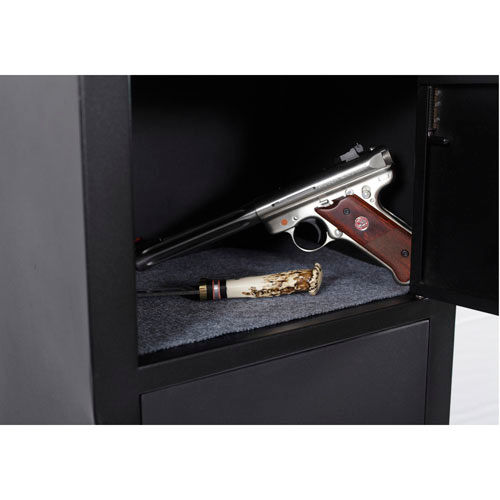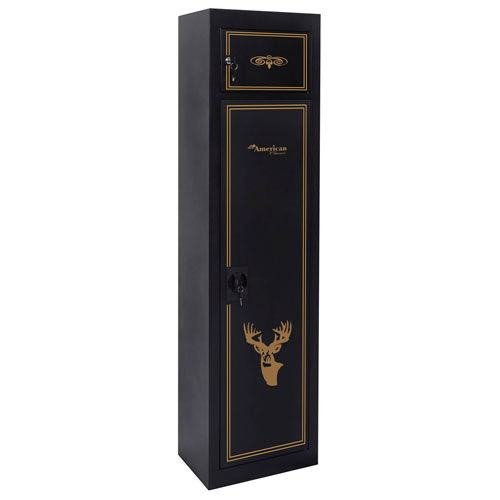 bAmerican Furniture Classics Metal Security Cabinet 906 - 5 Gun Capacity 59" Black Keep your small arms and ammo separate from your long guns with this metal security cabinet. This cabinet provides easy access to both storage areas with separate locking compartments. This fully assembled cabinet features a 3 point locking system for added security.