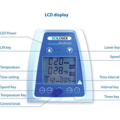 SCILOGEX RE100-Pro Rotary Evaporator including vertical dry-ice condenser, 5L bath, 1000ml evaporating flask NS 24/40 and 1000ml receiving flask KS 35/20, 110V, 50/60Hz, US Plug. Features: Easy to read large digital LCD display shows temperature, rotation speed and timerLarge 5L heating bath with a temperature range of ambient to 180 CMotorized lift with safety automatic release of the evaporating flask to the top position in case of power failureSpeed range from 20 to 280 RPMTimer function for precise control processingChemical-resistant PTFE seals and patented pressure springs provide excellent sealingPC control and documentation of all parameters via USBPrecise temperature control and adjustable safety circuitQuick release connectors for easy flask removal 2 year limited warranty.