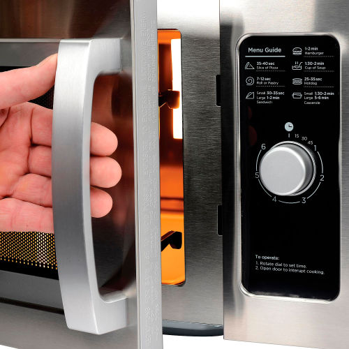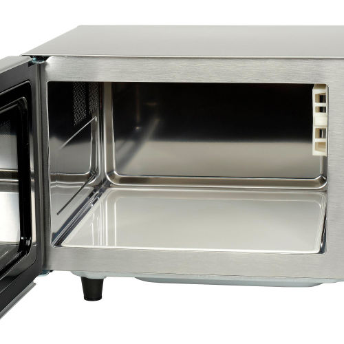 Powerful microwave with small footprint. Commercial 1000 watt microwave is ideal for quick, efficient heating of soups, sandwiches, prepackaged meals, beverages. Use in kitchens, break rooms, convenience stores and more. Easily accommodate a 12" platter. Simple dial control for easy control of cook time. Heavy duty stainless steel interior and exterior to withstand fast-paced environments with multiple users. 6 minute dial timer, and sturdy grab & go door handle. Automatic cool down fan runs for 60 seconds after each use so that unit does not overheat. ETL Sanitation Certified. 115 volts. ADA Compliant. 1 Year Limited Warranty Features:1000 Watts, 120 Volts0.9 cubic feet capacity6 minute dial timerInterior light and see through door. Heavy duty stainless steel interior and exteriorAutomatic cool down fanUL Listed, ETL Sanitation Certified to NSF Standards.