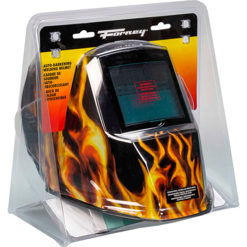 Forney Series auto-darkening welding helmets are ideal for the experienced do-it-yourselfer (DIY), light contractor, farmer and rancher. The Forney Series feature and benefits focus on ease of use, reliability and value added that are visibly apparent. Shell and Headgear Features:Lightweight, impact resistant, fireproof shell Dual crown strap headgear with multi-directional adjustment for a more comfortable fitQuick-fit, 5-point adjustable geared headband with sweatband mechanism greatly reduces head, neck strain and general fatigue caused by repeated lowering of the helmet during day-to-day welding operations Viewing Area:5.97 square inches (3.62" x 1.65") viewing areaHigh Definition True Color Clarity for a more natural viewing experienceTwo optical arc sensors help protect against the hazards of arc flash1/1/1/2 optical clarity rating for a clear, crisp and uniform viewing areaUV/IR coating to reduce scratching and discoloration of the lens Performance:External shade selector knob with grind option allows for quick shade modificationsInternal switch controls include both sensitivity (high-low) and delay (min.-max.). Internal controls help minimize the risks of damage to the controls themselves or accidental setting changes while in use.DIN 9 to 13 variable shade selection (TIG operable to 5 amps)1/25,000 per second switching speedSolar cells with non-replaceable 3V lithium batteries (CR2032) and automatic on/off technology Compliance:Forney Series auto-darkening welding helmets meet or exceed all related CE standards (DIN and ISO), EN166, EN175, EN379 and ANSI Z87.1 safety standards Replacement Parts and Accessories:55759, Forney Easy Weld and Forney Series Outer Protective Lens, 2-Pack55760, Forney Easy Weld and Forney Series Inner Protective Lens, 2-Pack55761, Forney Easy Weld and Forney Series Outer Protective Lens, 5-Pack55762, Forney Easy Weld and Forney Series Lens Kit, 5-Pack (2 Inner Lenses and 3 Outer lenses)55767, 1.0 Diopter Magnifying Lens for Forney Easy Weld, Forney and Forney Pro Series Auto-darkening Welding Helmets55768, 1.5 Diopter Magnifying Lens for Forney Easy Weld, Forney and Forney Pro Series Auto-darkening Welding Helmets55769, 2.0 Diopter Magnifying Lens for Forney Easy Weld, Forney and Forney Pro Series Auto-darkening Welding Helmets55770, 2.5 Diopter Magnifying Lens for Forney Easy Weld, Forney and Forney Pro Series Auto-darkening Welding Helmets55786, Ratchet Headgear for Forney Series Auto-Darkening Welding Helmets.