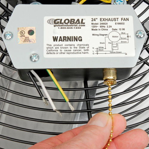 The 2 speed direct drive exhaust fan can be bolted directly to the wall. The guard mount exhaust fan is designed for low-pressure exhausting and cooling applications to provide optimum performance. Three aluminum fan blades are enclosed in steel spiral wire guards for safety. Built-in mounting holes in guards provide easy installation. The 1/4 HP, 120V, single phase motor is totally enclosed and permanently lubricated for long life, UL, cUL listed and conforms to UL507 standard. Exhaust fans have two speeds with pull chain operation. Includes junction box for direct wiring and built in welded mount brackets. Note: Rough-in hole size is 1/2" (+/- 5/16) larger than fan blade size. Optional wall shutters available. The product has a limited warranty of 1 year.