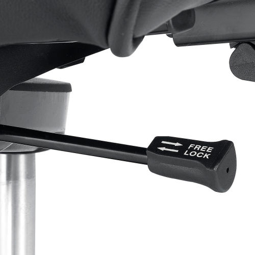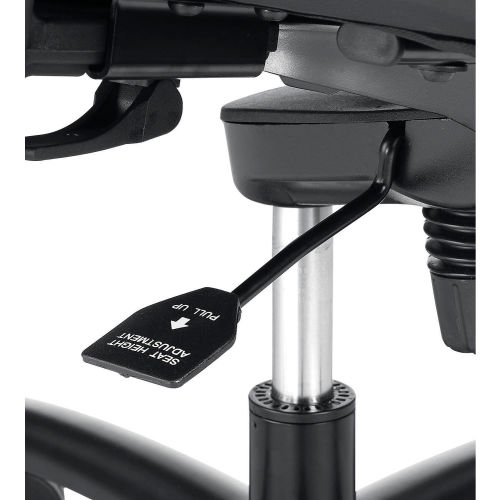 Interion BIG & TALL SEATING Total comfort for the big and tall. Reinforced, sturdy construction for longer life. Ultra-thick 3-3/4" foam cushioning. Genuine black leather upholstery. Extra wide and high 22-3/4"W x 22"D seat and 21-5/8"W x 29-7/8"H back. Pneumatic 18-1/2" to 21-1/4" height adjustment, trigger button movable armrests for custom positioning, and knee tilt with tilt-lock mechanism will help increase overall productivity. T-Arms are height adjustable. Sturdy aluminum five blade base with dual wheel swivel casters for added comfort. Large casters to support 450 lb. weight capacity. Brand is Interion By Global Industrial. Easy assembly.