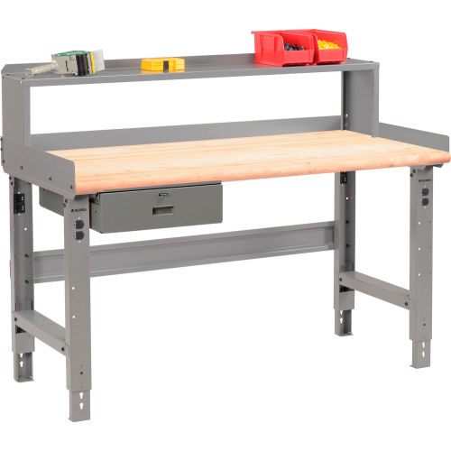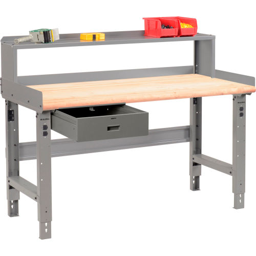 ✓ Rounded, safety-edge maple Boos butcher block by John Boos & Co. ✓ High weight capacity to handle most projects and tasks ✓ Riser kit & drawer under worktop This Global Industrial workbench is built to withstand years of heavy duty use. The ergonomically designed safety edge rolled front has no hard edge to damage parts or dig in when you lean against the bench. The 1-3/4" thick maple butcher block top bench provides quality that is functional and attractive. The solid grain hardwood is kiln dried, electronically cured and sealed with a mineral oil protectant to create a smooth, strong surface that can take continual pounding and use. The adjustable height legs feature removable duplex knockouts on front and rear for installation of either a hard wired electrical outlet or an optional plug-in outlet that easily screws into place with no wiring necessary. All steel parts are undercoated for rust resistance and finished with scratch-resistant gray powder coat. The workbench height adjusts at 1-1/2" increments. Bench Includes: Lockable DrawerSteel RiserBack & End StopsBench Stringer.