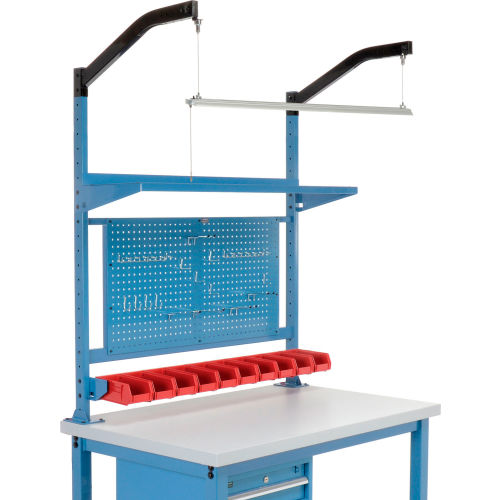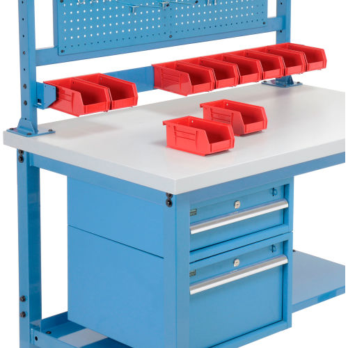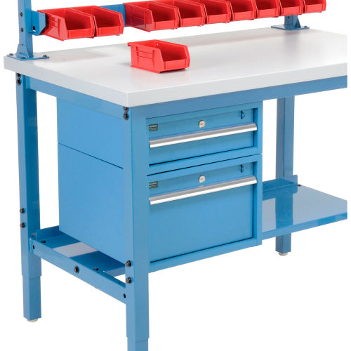 Heavy-Duty Complete Adjustable Height Production Workbench with Plastic Laminate Square Edge Top. This industrial workbench features rugged 2" square, 14 gauge tubular steel height adjustable legs. Legs adjust at 2" increments, and come with mounting hardware to attach to the bench top. Weight Capacity: 5000 lbs, evenly distributed. Bench Includes: 15"D Lower Shelf6"H Drawer12"H Drawer48"H UprightsBin railPegboard Panel Mounting KitCantilever ShelfLed Light Kit with Arm Mount.