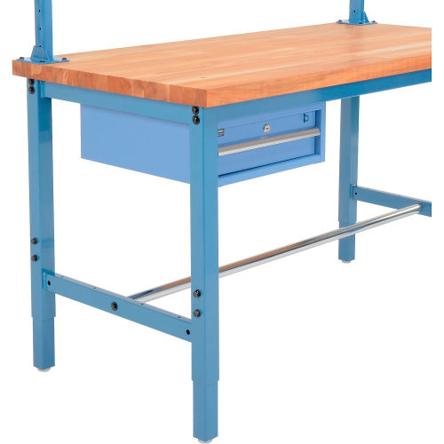 ✓ Square-edge maple Boos butcher block by John Boos & Co. ✓ High weight capacity to handle most projects and tasks ✓ Versatile configuration with drawer, upright, & shelf These production benches offer the same high quality construction as our heavy duty benches but with the added convenience of locking stackable drawers. High quality industrial work bench is built to last using rugged 2" x 2" x 14 gauge tubular steel height adjustable legs. Legs adjust at 2" increments. These workbenches are tested to 5,000 lb. capacity. 6"H drawer can be mounted to either left or right hand side under the counter top for lockable storage. Secures valuable tools, supplies and more using a cylinder lock with 2 keys. Drawer runs smooth on nylon rollers. Base includes a set of adjustable leveling floor glides and a set of leveling foot plates that allow floor anchoring. Powder coat finish. Quick and easy assembly. Bench Includes: Lockable DrawerUpright Kit with Shelf.