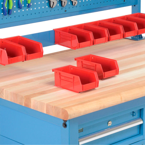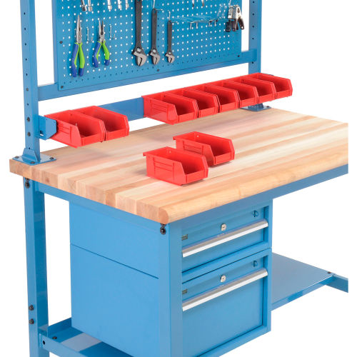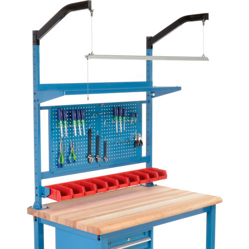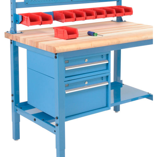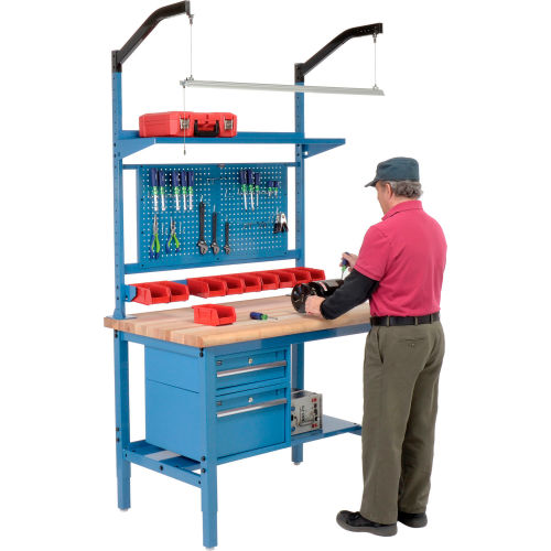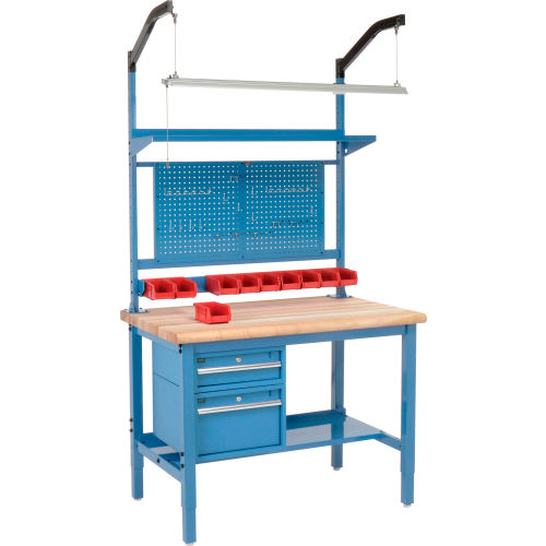 ✓Rounded, safety-edge maple Boos butcher block by John Boos & Co. ✓ High weight capacity to handle most projects and tasks ✓ Versatile configuration with power, drawers, lights, and more HEAVY DUTY COMPLETE HEIGHT ADJUSTABLE PRODUCTION WORKBENCH Maple Butcher Block Safety Edge Industrial workbench features rugged 2" square, 14 gauge tubular steel height adjustable legs. Legs adjust at 2" increments, and come with mounting hardware to attach to the bench top. Weight Capacity: 5000 lbs, evenly distributed. Bench Includes: 15"D Lower Shelf6"H Drawer12"H Drawer48"H UprightsBin railPegboard Panel Mounting KitCantilever ShelfLed Light Kit with Arm Mount.