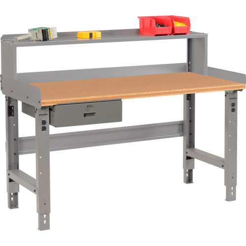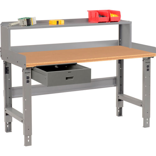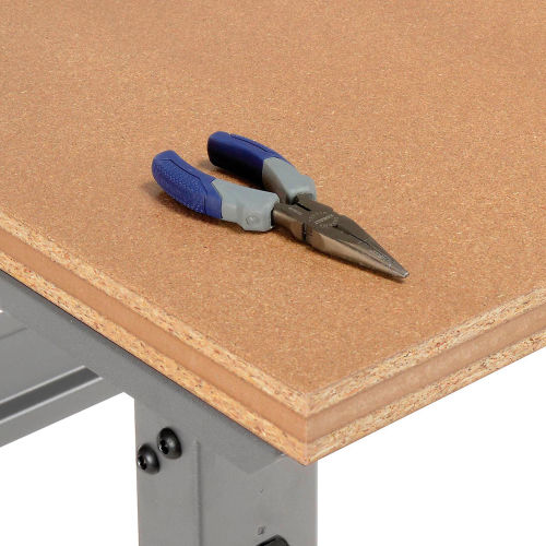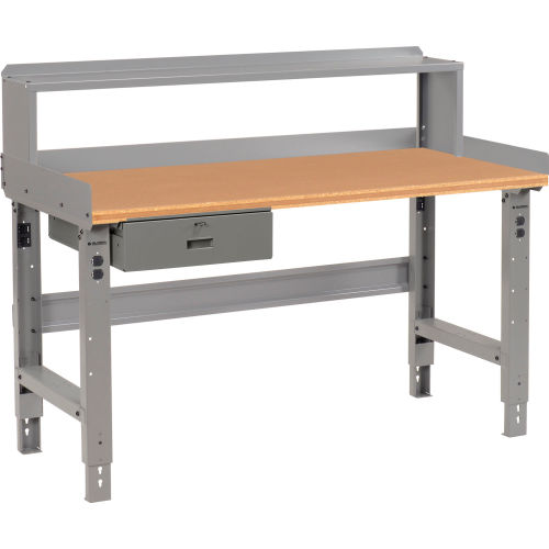 Global Industrial's workbench with 1-1/2" shop top provides a smooth, extra-strong, non-conductive work surface. Its durable tempered hardboard is bonded to a particleboard core built to withstand rugged treatment. The smooth hardwood edges resist moisture. It won't warp or splinter. This 96"L workbench includes 3 leg frames for stability and reinforcement. The adjustable height legs feature removable duplex knockouts on front and rear for installation of either a hard wired electrical outlet or an optional plug-in outlet that easily screws into place with no wiring necessary. Its legs are finished with scratch-resistant gray powder coat. The bench stringer comes with mounting hardware to assemble legs to the bench top. The workbench height adjusts at 1-1/2" increments. Bench Includes: Lockable DrawerSteel RiserBack & End StopsBench Stringer.