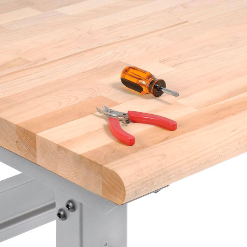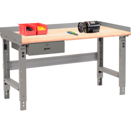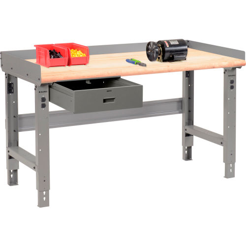 ✓ Rounded, safety-edge maple Boos butcher block by John Boos & Co. ✓ High weight capacity to handle most projects and tasks ✓ Integrated drawer under worktop This Global Industrial workbench is built to withstand years of heavy duty use. The ergonomically designed safety edge rolled front has no hard edge to damage parts or dig in when you lean against the bench. The 1-3/4" thick, maple butcher block top bench provides quality that is functional and attractive. The solid grain hardwood is kiln dried, electronically cured and sealed with a mineral oil protectant to create a smooth, strong surface that can take continual pounding and use. The workbench height adjusts at 1-1/2" increments. Its 5-3/8"H steel drawer features a safety stop to prevent accidental spilling. The drawer has 2 mounting angle brackets for easy workbench installation on either the left or right hand side. This workbench has a recessed handle with padlockable hasp for added security (lock sold separately). The adjustable height bench stringer comes with mounting hardware to assemble legs to the bench top. The legs feature removable duplex knockouts on front and rear for installation of either a hard wired electrical outlet or an optional plug-in outlet that easily screws into place with no wiring necessary. The bench stringer comes with mounting hardware to assemble legs to the bench top. Its legs are finished with scratch-resistant gray powder coat. It is easy to assemble. Bench Includes: Lockable DrawerBack & End StopsBench Stringer.