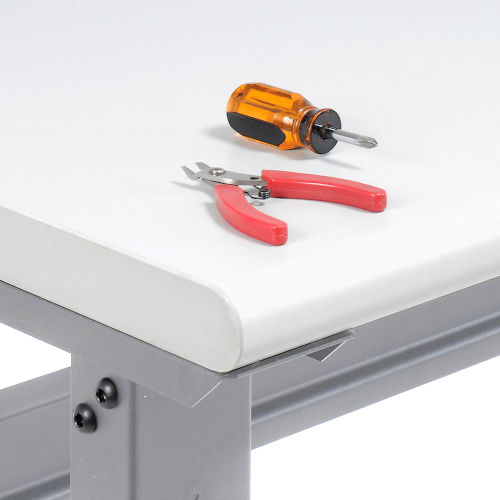 This workbench has a 1-1/4" thick conductive white plastic top. It is ideal in situations when static electricity control is required. The properly grounded work surface rapidly bleeds off static build-up and prevents damage to sensitive electronic circuitry during assembly. It dissipates 5000V static charge in 0.01 sec with surface resistance of 10 10 . The workbench is easy to clean with soap and water. It complies with MIL-B81705B and 101B, 101C, Method 4046. The adjustable height legs feature removable duplex knockouts on front and rear for installation of either a hard wired electrical outlet or an optional plug-in outlet that easily screws into place with no wiring necessary. Its legs are finished with scratch-resistant gray powder coat. The bench stringer comes with mounting hardware to assemble legs to the bench top. The workbench height adjusts at 1-1/2" increments. Bench Includes: Lockable DrawerSteel RiserBack & End StopsBench Stringer.