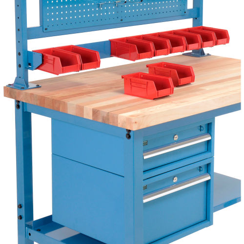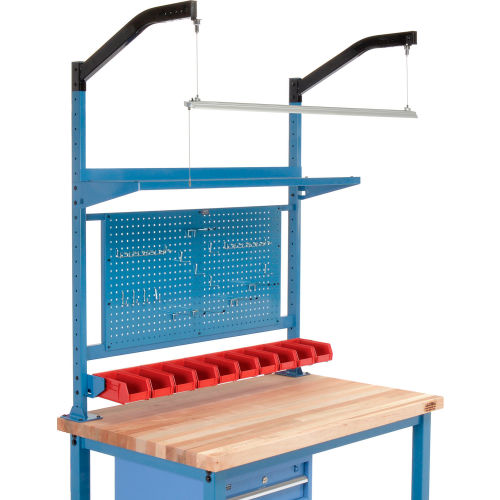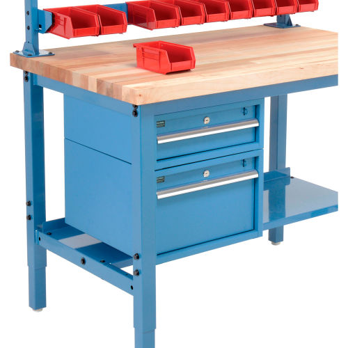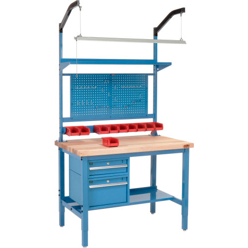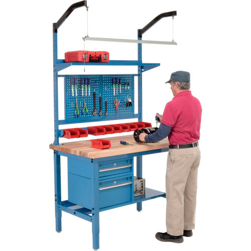 ✓ Square-edge maple Boos butcher block by John Boos & Co. ✓ High weight capacity to handle most projects and tasks ✓ Versatile configuration with power, drawers, lights, and more HEAVY DUTY COMPLETE HEIGHT ADJUSTABLE PRODUCTION WORKBENCH Maple Butcher Block Square Edge Industrial workbench features rugged 2" square, 14 gauge tubular steel height adjustable legs. Legs adjust at 2" increments, and come with mounting hardware to attach to the bench top. Weight Capacity: 5000 lbs, evenly distributed. Bench Includes: 15"D Lower Shelf6"H Drawer12"H Drawer48"H UprightsBin railPegboard Panel Mounting KitCantilever ShelfLed Light Kit with Arm Mount.