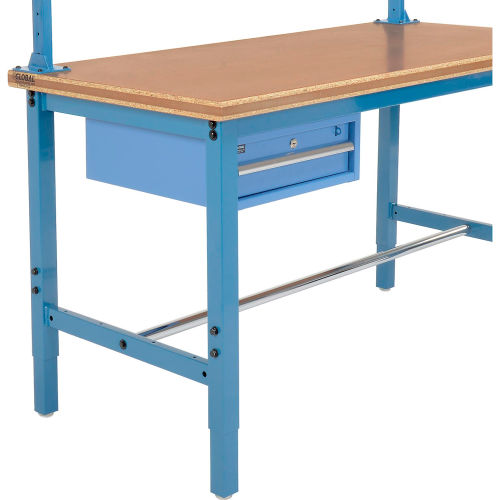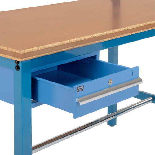 These production benches offer the same high quality construction as our heavy duty benches but with the added convenience of locking stackable drawers. High quality industrial workbench is built to last using rugged 2" x 2" x 14 gauge tubular steel height adjustable legs. Legs adjust at 2" increments. These workbenches are tested to 5,000 lb. capacity. 6"H drawer can be mounted to either left or right hand side under the counter top for lockable storage. Secures valuable tools, supplies and more using a cylinder lock with 2 keys. Drawer runs smooth on nylon rollers. Base includes a set of adjustable leveling floor glides and a set of leveling foot plates that allow floor anchoring. Powder coat finish. Quick and easy assembly. Bench Includes: Lockable DrawerUpright Kit with Shelf.