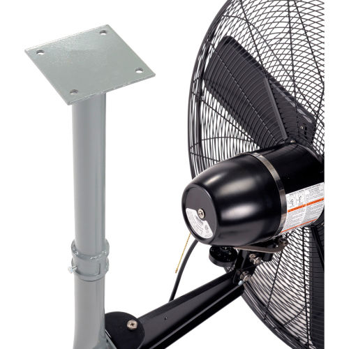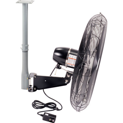 Global Industrial's Outdoor Rated Oscillating Ceiling Mount Fan has a 2-speed Totally Enclosed Non-Ventilated (TENV) 3/10 HP motor, moisture rated IP24, powering three precision balanced Aluminum fan blades. Wall fan comes with a 9.8' GFCI Type Plug. This oscillating fan uses a 70 oscillating sweep, and allows fixed head positioning. Black Powder Coated Zinc Plated Grille- UV Resistant. ETL and cETL Listed and conforms to UL507 Standard. Ceiling Mount suspends from ceiling. Includes two 1-1/2" pipes for fan and ceiling-mounting and hardware. This product has limited warranty of 1 year.