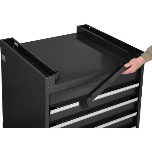 Cabinet Base for Global Modular Drawer Cabinet 30"Wx27"D, Black Forklift channels on base of cabinet provide necessary clearance for moving cabinet with pallet truck. Clear dimensions 22"W x 2-1/2"H. Channels increase overall height by 2-1/2". Hardware included. Overall cabinet height with base is 32"H.