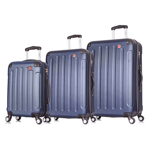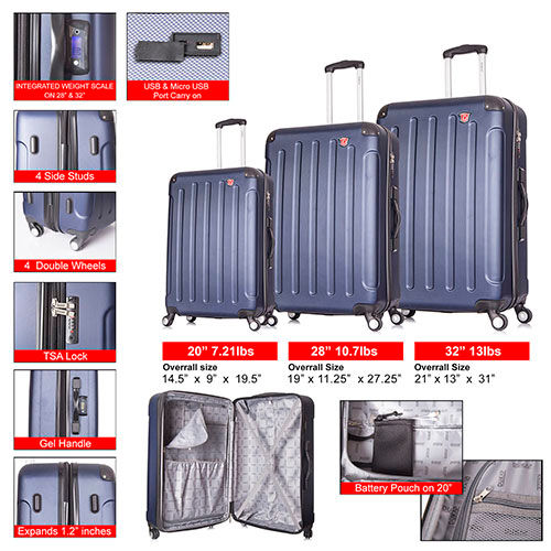 The DUKAP Intely collection is made of lightweight PC/ABS engineered material with micro diamond finish. The hard-flex construction offers maximum strength, durability and a water/scratch resistant finish. Offering a contemporary modern style with 4 dual spinner 360 wheels for effortless mobility, built in TSA Approved combination lock, 1.2" expandable for additional space, front productive corner bumpers to withstand higher impacts, full interior fabric lining with zippered compartment on one side and snap-on straps on the opposite side for easy packing plus one inside mesh zippered pocket and 2 slip pockets perfect for shoes, push button locking internal retractable trolley system, top and side ergonomic GEL handles for comfortable and easy lifting, 4 side studs that allows the luggage to stand upright and smooth gliding oversized zippers. The carry-on features an integrated USB and micro USB port providing access to power on the go. The Medium and Large sizes feature an exterior side integrated digital weight scale will allow you to avoid those extra overweight baggage fees. This high-tech luggage will display the total weight before traveling allowing you to comply with your carrier's weight specifications and any problems. This product can be purchased in different colors.