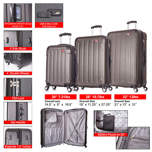 The DUKAP Intely collection is made of lightweight PC/ABS engineered material with micro diamond finish. The hard-flex construction offers maximum strength, durability and a water/scratch resistant finish. Offering a contemporary modern style with 4 dual spinner 360 wheels for effortless mobility, built in TSA Approved combination lock, 1.2" expandable for additional space, front productive corner bumpers to withstand higher impacts, full interior fabric lining with zippered compartment on one side and snap-on straps on the opposite side for easy packing plus one inside mesh zippered pocket and 2 slip pockets perfect for shoes, push button locking internal retractable trolley system, top and side ergonomic GEL handles for comfortable and easy lifting, 4 side studs that allows the luggage to stand upright and smooth gliding oversized zippers. The carry-on features an integrated USB and micro USB port providing access to power on the go. The Medium and Large sizes feature an exterior side integrated digital weight scale will allow you to avoid those extra overweight baggage fees. This high-tech luggage will display the total weight before traveling allowing you to comply with your carrier's weight specifications and any problems. This product can be purchased in different colors.