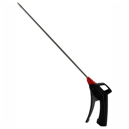 The stainless steel bent nozzle includes an OSHA compliant side vent in the event of the tip being obstructed. The extended reach slim nozzle is ideal for reaching into tight spaces. The pistol grip type body of this blow gun offers an ergonomic, dual material grip and a variable control trigger. Store the blow gun using the integrated hang loop right on the body. This high performance blow gun offers a pressure range of 50 to 235 PSI and 15 SCFM.