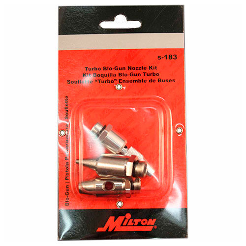 Three piece turbo Blow Gun nozzle kit is perfect for adding versatility to Milton Turbo Blow Guns. Simply thread nozzle onto the end of the S-181 or S-182 turbo Blow Gun. One of each: Adjustable, High Volume and Fan Spray For Milton #S-181 and #S-182.