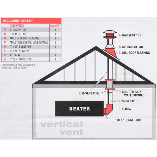 HeatStar Vertical Vent Kit - F102848 Includes: (1) 4 elbow, (2) 4 x 24 26 gauge pipe, (1) 4 x 36 B. vent pipe, (1) adjustable ceiling/wall thimble, (1) adjustable roof flashing, (1) storm collar, (1) 4 gas vent top, (1) 3 x 4 Adapter.