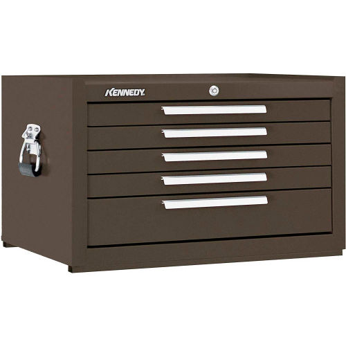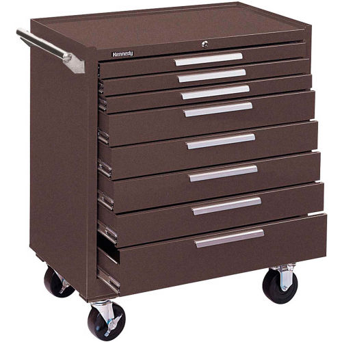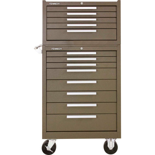 Kennedy 8-Drawer Roller Cabinet w/ Ball Bearing Slides - Brown Kennedy 8-Drawer Industrial Roller Cabinet is made of heavy gauge steel body with a durable powder coat finish. Top surface feature raised edges on 3 sides to retain contents. High security tubular lock with 2 keys secures all drawers. Drawers feature internal, automatic locking system. Drawers include aluminum drawer pull handles. Cabinet includes snap-in friction drawer slides for smooth operation under heavy loads. Heavy duty tubular side handles for easy steering. Moves easily on 5" roller bearing casters (2 rigid, 2 swivel with brakes). Brown finish. wide. Kennedy 5-Drawer Mechanics Chest w/ Ball Bearing Slides - Brown Kennedy 5-Drawer Mechanics Chest is made of heavy gauge steel with a powder coat finish. Folding steel handles for lifting. Reinforced clam shell lid with hinges allows full access to top compartment. Aluminum drawer pull handles. Tubular lock secures all drawers. Includes snap-in ball bearing drawer slides for smooth operation under heavy loads. Lift-Out Tray includes a socket set divider. Add-On Bases can be placed under Chest for additional storage. Brown finish.
