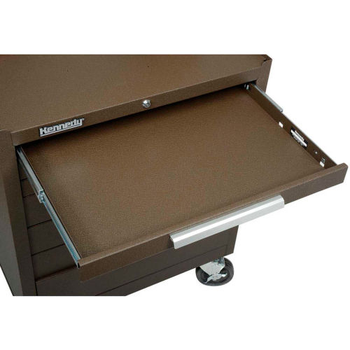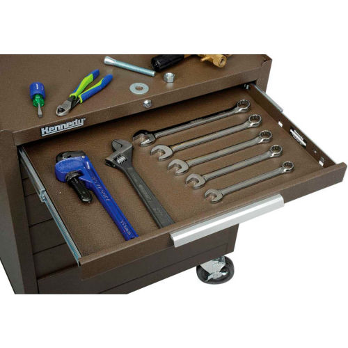 Kennedy 277XB,MC22B,520B X X 56-1/2 16 Drawer Roller Cabinet & Machinest Chest Combo Kennedy 7-Drawer Roller Cabinet w/ Ball Bearing Slides - Brown Kennedy 7-Drawer Industrial Roller Cabinet is made of heavy gauge steel body with a durable powder coat finish. Top surface feature raised edges on 3 sides to retain contents. High security tubular lock with 2 keys secures all drawers. Drawers feature internal, automatic locking system. Drawers include aluminum drawer pull handles. Cabinet includes snap-in ball bearing drawer slides for smooth operation under heavy loads. Heavy duty tubular side handles for easy steering. Moves easily on 5" roller bearing casters (2 rigid, 2 swivel with brakes). Brown finish. wide. Kennedy 21" 2-Drawer Machinists Chest - Brown Kennedy 2-Drawer Machinist Tool Chest offers high quality and durability that's been handed down by generations of American craftsmen. Drawers and top-till feature wool felt lining. Drawers include adjustable, zinc-coated steel drawer dividers for organized storage. Spring clips in drawers hold contents in place. Tubular lock secures all drawers. 21-5/8" wide. Brown powder coat finish. Kennedy 20" 7-Drawer Machinists Chest - Brown Kennedy 7-Drawer Machinist Tool Chest offers high quality and durability that's been handed down by generations of American craftsmen. Drawers and top-till feature wool felt lining. Top handle is made of vinyl cushioned steel for a durable, yet comfortable grip. Drawers include adjustable, zinc-coated steel drawer dividers for organized storage. Spring clips in drawers hold contents in place. Tubular lock secures all drawers. 20-1/8" wide. Brown powder coat finish.