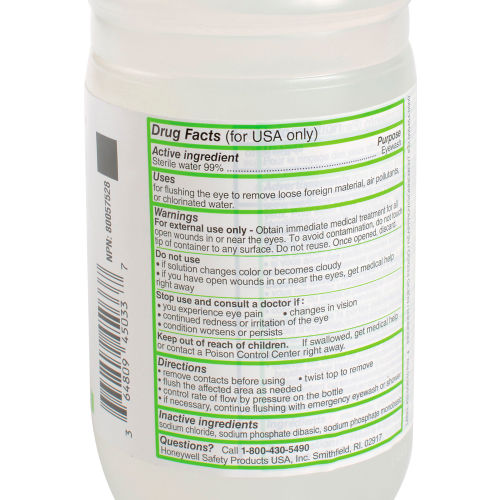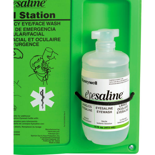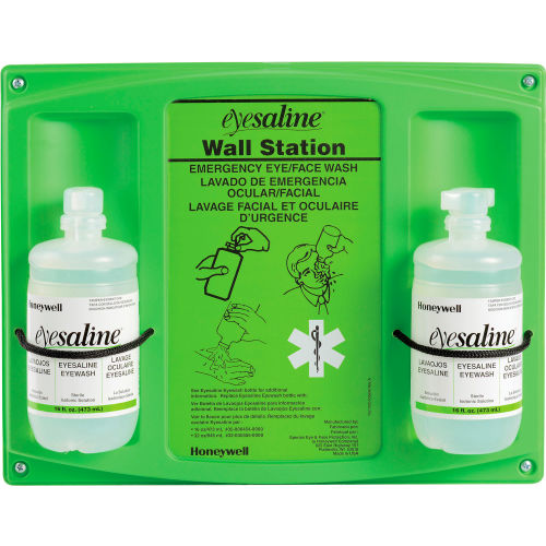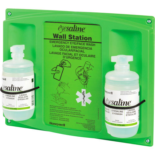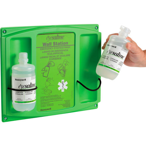 Honeywell Eye And Face Wash Oz. Two Bottle Station, 1 Bottle Durable, open-face design Wall Stations hold bottles firmly in place with easy access to bottles in an emergency to provide immediate flushing until the injured person can be helped to a primary emergency eyewash device. They offer high visibility in a hazard area and are readily available for emergency flushing and decontamination of the eyes, face and body. Each system is designed for easy "snap-out" access to Eyewash or Body flush bottles. Wall Stations mount easily with provided fasteners. Integral overhang protects bottles from dust and debris to minimize maintenance requirements. Durable plastic is easy to clean. All wall stations include Personal Eyewash or Body flush. Extended flow opening provides longer flow rate than conventional bottles.