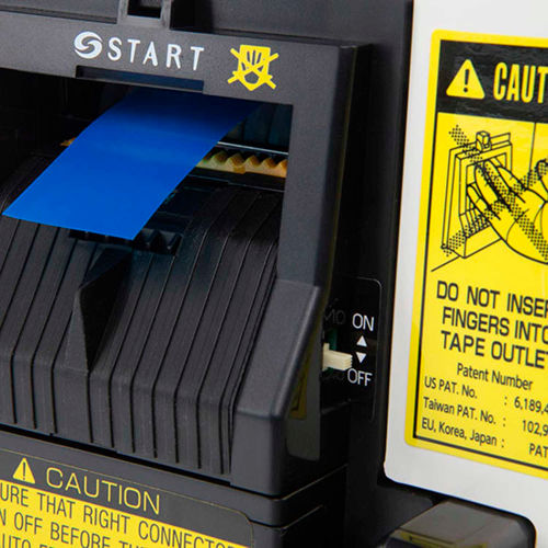 The Start International ZCM1100DC electronic tape dispenser with safety guard automatically dispenses and cuts most types of tape up to (51mm) wide. Originally introduced by Start International, the ZCM1100DC is one of the most reliable and accurate tape dispensers on the market. Quickly and easily program a desired length digitally and the ZCM1100DC will precisely dispense and cut with accuracy of 1mm. The ZCM1100DC includes a built in safety guard cutting head that prevents cutting injuries by disabling the cutter when foreign objects are present. Features: Safety guard cutting head prevents cutting injuriesAuto feed and cut tape dispenserDigital length adjustment.28" - (7-50mm) in tape width1.2" - 39" (30 - 999mm) in tape lengthIncludes 3-in-1 core holder (1", 1.4", 3")Steel frame for durabilityTape dispenser works with 18V DC 2.5 AmpsPower plug has an integrated transformer from 110V 50/60 Hz to 18V DC.
