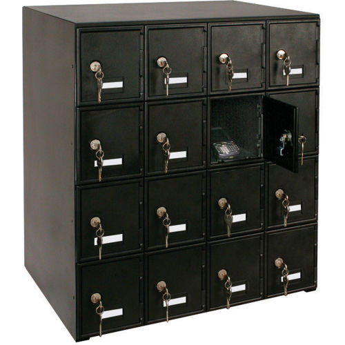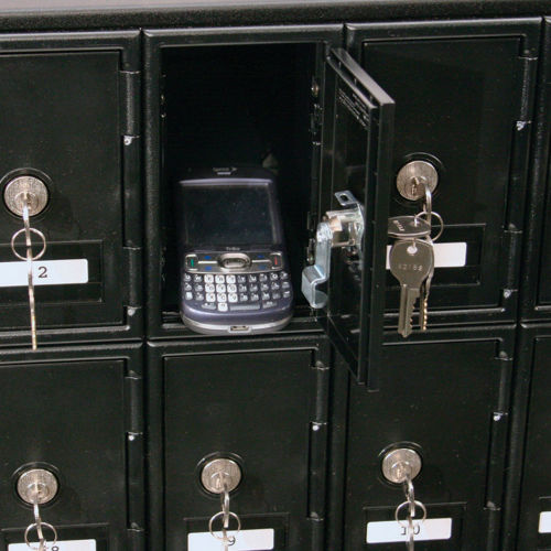 Cell phone lockers are perfect for schools, offices, government facilities, restaurants and anywhere employees need to store personal items or supplies. Conveniently stores cell phones, keys, wallets and more. Made with a tough 22 gauge steel cabinet and thick polycarbonate doors. Compartment interior is 15"D. Each compartment includes a self-adhesive paper decal and clear plastic protective cover for labeling or numbering compartment doors. Key Lockable doors include 2 keys for each compartment. Measures 22"W x 16"D x 26"H overall. Black powder coat finish. Can be placed on any flat surface or use with Optional 6"H Base for floor mounting. Ships assembled. Note: Number plate sold separately.