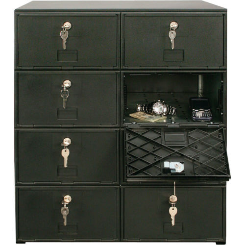 Cell phone lockers are perfect for schools, offices, government facilities, restaurants and anywhere employees need to store personal items or supplies. Conveniently stores cell phones, keys, wallets and more. Made with a tough 22 gauge steel cabinet and thick polycarbonate doors. Compartment interior is 15"D. Each compartment includes a self-adhesive paper decal and clear plastic protective cover for labeling or numbering compartment doors. Key Lockable doors include 2 keys for each compartment. Measures 22"W x 16"D x 26"H overall. Black powder coat finish. Can be placed on any flat surface or use with Optional 6"H Base for floor mounting. Ships assembled. Note: Number plate sold separately.
