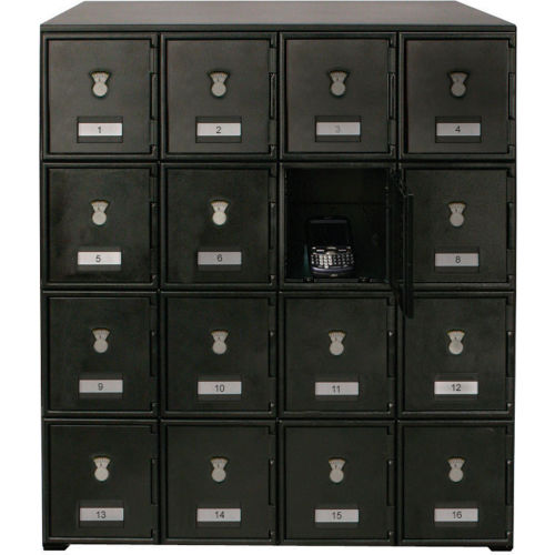 CELL PHONE LOCKERS 16 Door Locker with Combination Locks Cell phone lockers are perfect for schools, offices, government facilities, restaurants and anywhere employees need to store personal items or supplies. Conveniently stores cell phones, keys, wallets and more. Made with a tough 22 gauge steel cabinet and thick polycarbonate doors. Compartment interior is 15"D. Each compartment includes a self-adhesive paper decal and clear plastic protective cover for labeling or numbering compartment doors. Each locker door has a Combination Lock that is resettable for personalized security. Measures 22"W x 16"D x 26"H overall. Black powder coat finish. Can be placed on any flat surface or use with Optional 6"H Base for floor mounting. Ships assembled. Note: Number plate sold separately.
