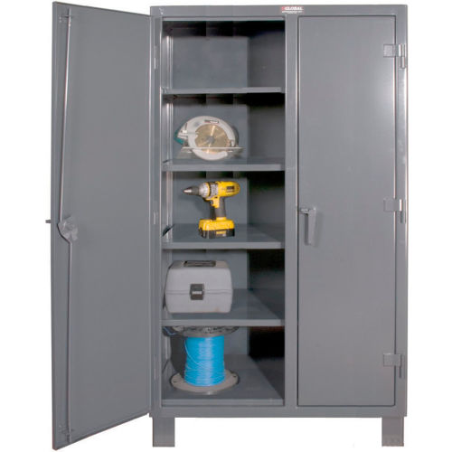EXTRA HEAVY DUTY STORAGE CABINETS Double Shift Storage Cabinet Extra heavy duty storage cabinet is built to last with heavy gauge, all welded steel. Made using heavy duty, all welded 12 gauge steel with gray powder coat finish. Padlockable 3-point latching system with 3/8" diameter locking rods offers superior security. Dual doors swing open 180 and feature 4"H x 7 gauge leaf hinges with secure hinge pins and cast iron handles. 14 gauge shelves adjust at 2-1/2" increments. 4 shelves on each side for a total of 8 shelves. Double shift cabinet provides 2 separate compartments for securing the first shift's valuables while the second shift is on duty. Each compartment includes height adjustable shelves. Base allows forklift access using two 6"W x 3/16" thick legs. Legs are pre-drilled to allow floor anchoring. Fully assembled.