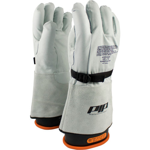 PIP Top Grain Goatskin Leather Protector for Novax Gloves - Gauntlet Cuff For use with Class 1-4 rubber insulating Novax gloves. A leather protector is only to be used for mechanical protection for rubber insulating gloves. Not to be used for electrical protection per ASTM F696-06 (2011) Standard. Features: Top Grain Goatskin leather construction is the softest, most abrasion-resistant leather and is highly recommended for applications requiring tactile sensitivityTop Grain leather is smooth, provides durability and dexteritySplit leather gauntlet cuff for added forearm protection, allows for fast removal and adds water resistanceStraight thumb increases comfort in closed-fisted workNylon strap with buckle for a secure, personal fitColor coded hems for easy size identificationMeets ASTM F696-06 (2011) standard.