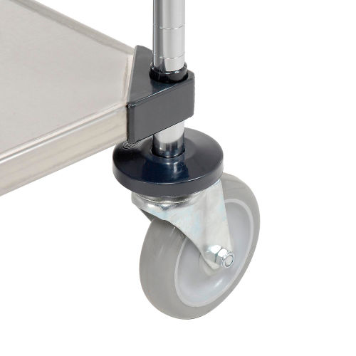 Durable, corrosion resistant carts are perfect for hospitals, clean rooms and labs. Cart offers Type 304 stainless steel shelves for maximum rust resistance. Shelves adjust on 1" increments on numbered posts to accommodate various sized loads. Handles have a bright, chrome plated finish. 5" x 1-1/4" polyurethane swivel casters with donut bumpers to help protect walls. 38"H. Easy assembly. This product has Limited Warranty of 1 Year.
