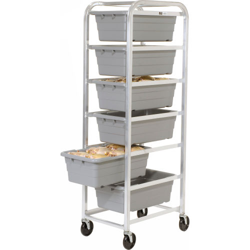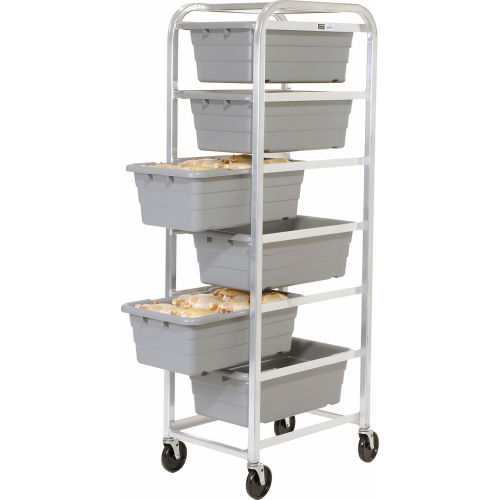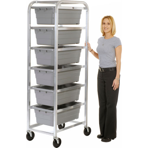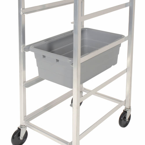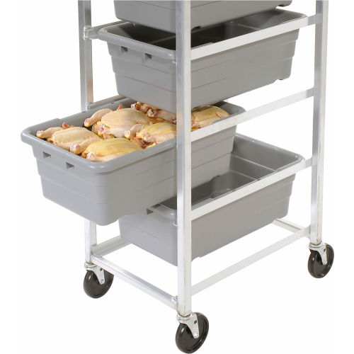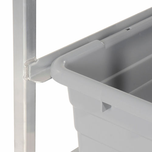 LUG TOTE BOX CARTS All Welded Aluminum Cart Tote box carts make transporting bin totes easy! These tote lug carts are designed for transporting and storing anything from small parts, components to food and recyclables. Durable tote carts roll smoothly on casters. Slide runners support tote boxes and allow quick, easy access. These tote carts accept plastic tote boxes that measure 25-1/8"L x 16"W x 8-1/2"H (totes sold separately). Made with lightweight, tubular all welded aluminum framing. Moves easily on 5" polyolefin swivel casters.