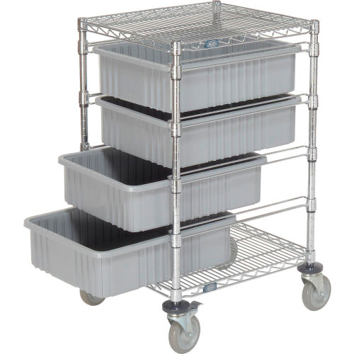 CHROME WIRE CARTS WITH DIVIDABLE GRID CONTAINERS Chrome Wire Cart Chrome wire bin carts when combined with dividable grid containers (sold separately) are ideal for storing small to large parts. Bin carts feature adjustable slides for convenient bin access. Easily slide bins in and out for access and storage. Slides are height adjustable at 1" increments. Chrome wire carts offer an attractive finish that's suitable for retail environments. Withstands up to 1,200 lb. capacity. Top and bottom chrome wire shelves feature truss perimeter for extra strength and reinforcement while allowing light, air and sprinkler penetration. Open wire design helps reduce dust accumulation. Moves easily on four 5" polyurethane swivel casters (2 with brakes). Easy assembly. Overall height with casters 40".