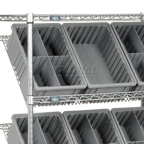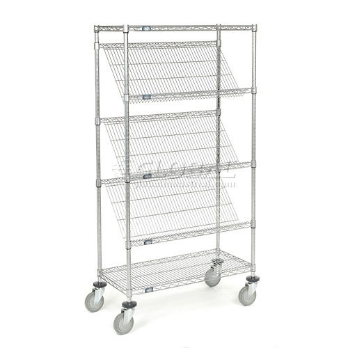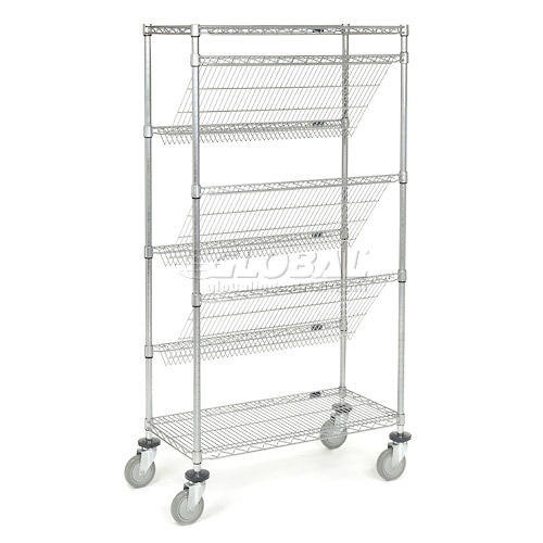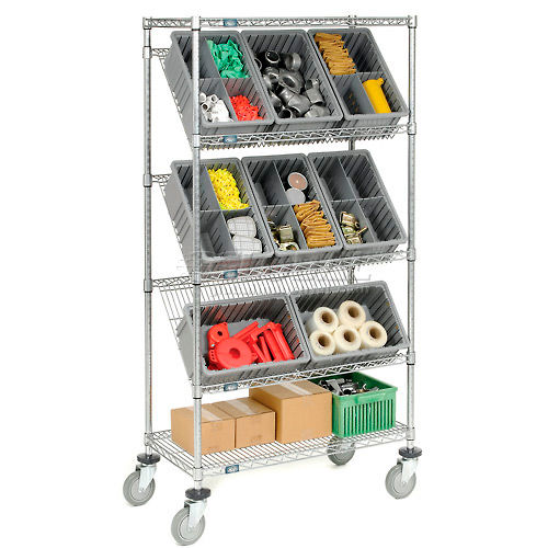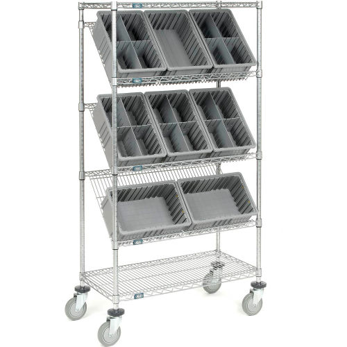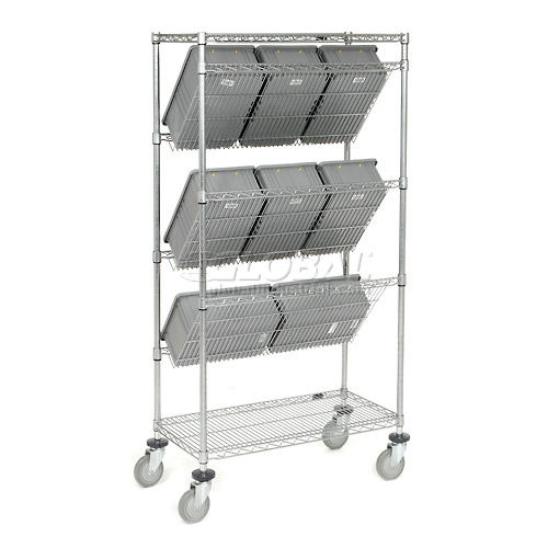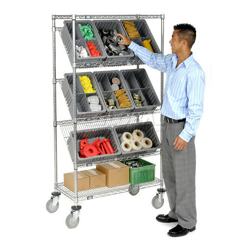 Easy Access Slant Shelf Chrome Wire Cart With 12 3-1/2"H Grid Containers Gray, 36"L x 18"W x 63"H These slant shelf container trucks are perfect for parts picking and assembly operations. Slant shelves allow easy access to contents with removing containers and provide maximum content visibility. Slanted shelves also promote first in-first out rotation of contents, making them perfect for assembly environments. Durable steel construction with chrome plated finish provides an attractive appearance suitable for retail environments. Offers 1,200 lb. capacity. Includes flat shelves for top and bottom levels to provide standard storage for supplies. Shelves easily adjust at 1" increments on numbered posts for tool free adjustments. Includes four 5" polyurethane swivel casters with brakes for easy mobility. Dissipative Ground Chain to help protect cargo from harmful static electricity. 45° angle slanted shelves provide easier access to containers. Easy Assembly.