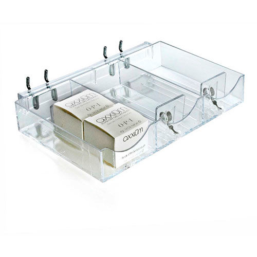 Three-compartment pusher tray measures 9.125"W x 5.8125"D x 1.5"H. Each slot measures 2.8125"W x 5.5"D. Use this tray on pegboard or slatwall. Includes two U-Hooks. Choose to add a flip-up c-channel.